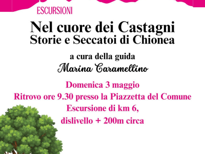 Domenica 3 maggio, in occasione de 'Il Cuore della Montagna', l’accompagnatrice naturalistica Marina Caramellino organizza un'escursione tra i castagneti di Chionea alla scoperta degli antichi seccatoi.