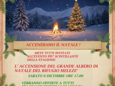Sabato 6 dicembre, dalle 17 al rifugio Melezè di Bellino, ci sarà l'accensione del grande albero di Natale. A tutti i partecipanti verranno fragranti frittelle di mele da gustare attorno al fuoco del falò. Ingresso libero.