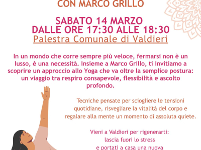 Sabato 14 marzo, dalle ore 17,30 alle ore 18,30 presso la Palestra Comunale di Valdieri, in occasione della rassegna "Marzo in Rosa" vi attende un incontro rigenerante con il maestro yoga Marco Grillo.