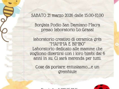 Sabato 21 marzo, a partire dalle ore 15,00 alle ore 17,00 presso la borgata "Podio" di San Damiano Macra, vi attende un laboratorio di ceramica grès dedicato alle mamme con i propri figli dai 6 anni in sù. Ci sarà la merenda!