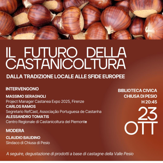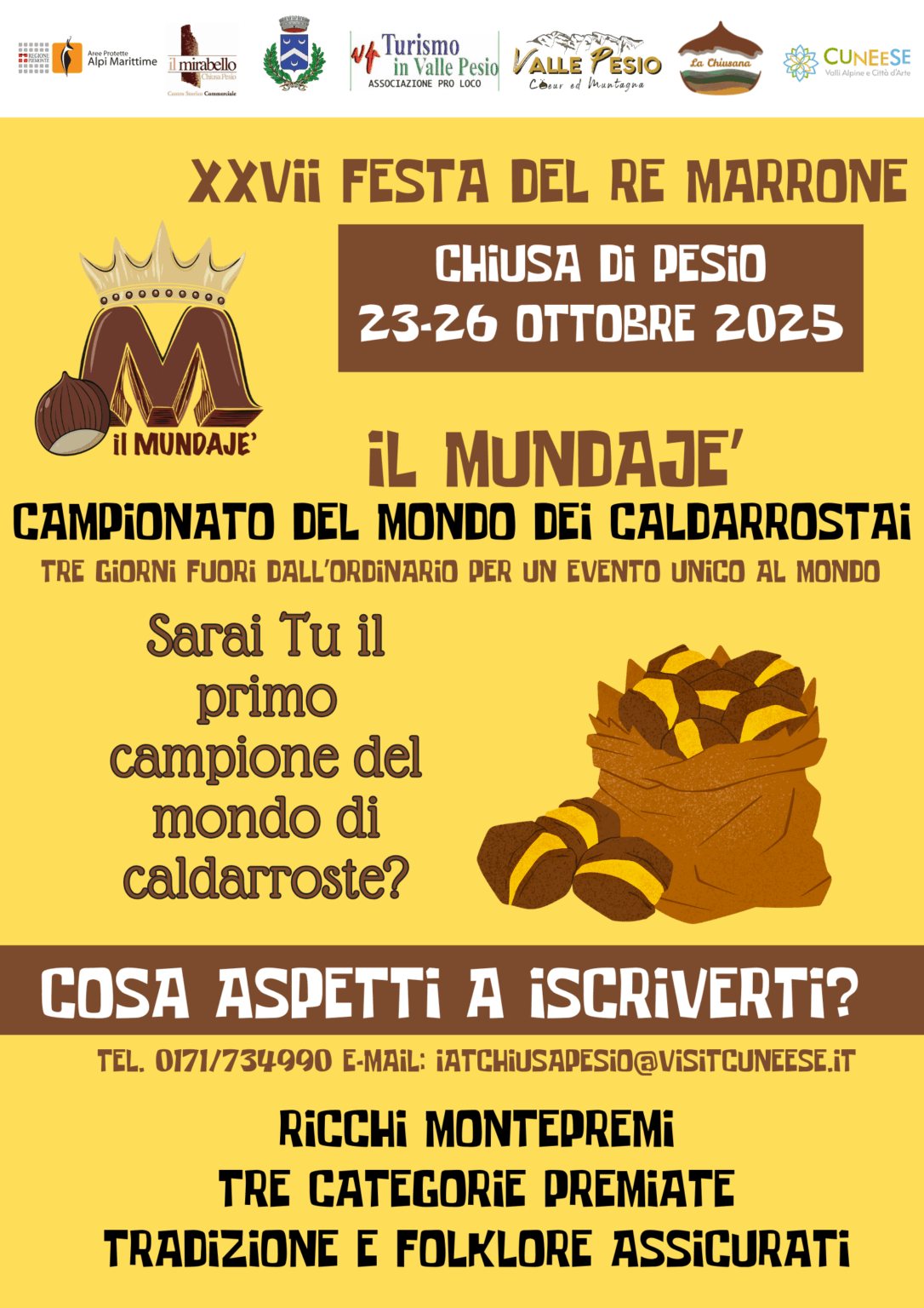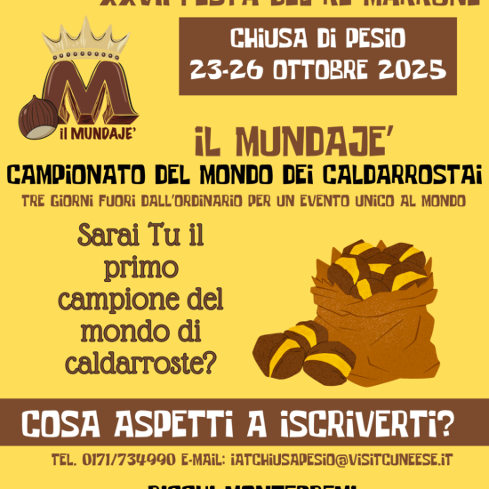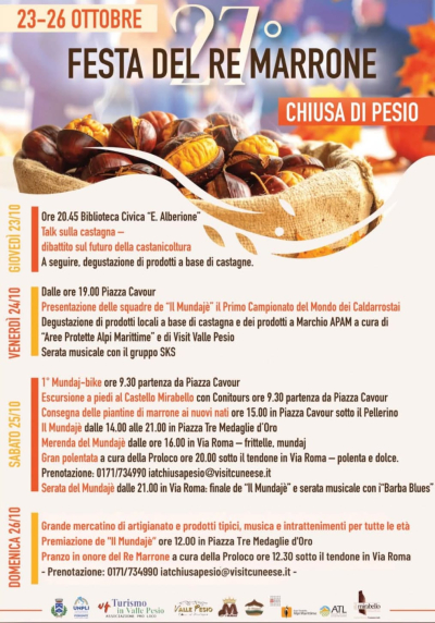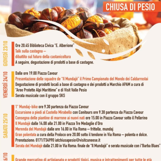 Chiusa di Pesio è pronta ad accogliere la 27ª edizione della Festa del Re Marrone, in programma da giovedì 23 a domenica 26 ottobre. Quattro giornate dedicate ai sapori d’autunno, tra degustazioni, artigianato di qualità e prodotti tipici, con protagonista assoluto il Marrone di Chiusa di Pesio, frutto pregiato che cresce nell’areale delle “Vigne”, poco a valle del paese.