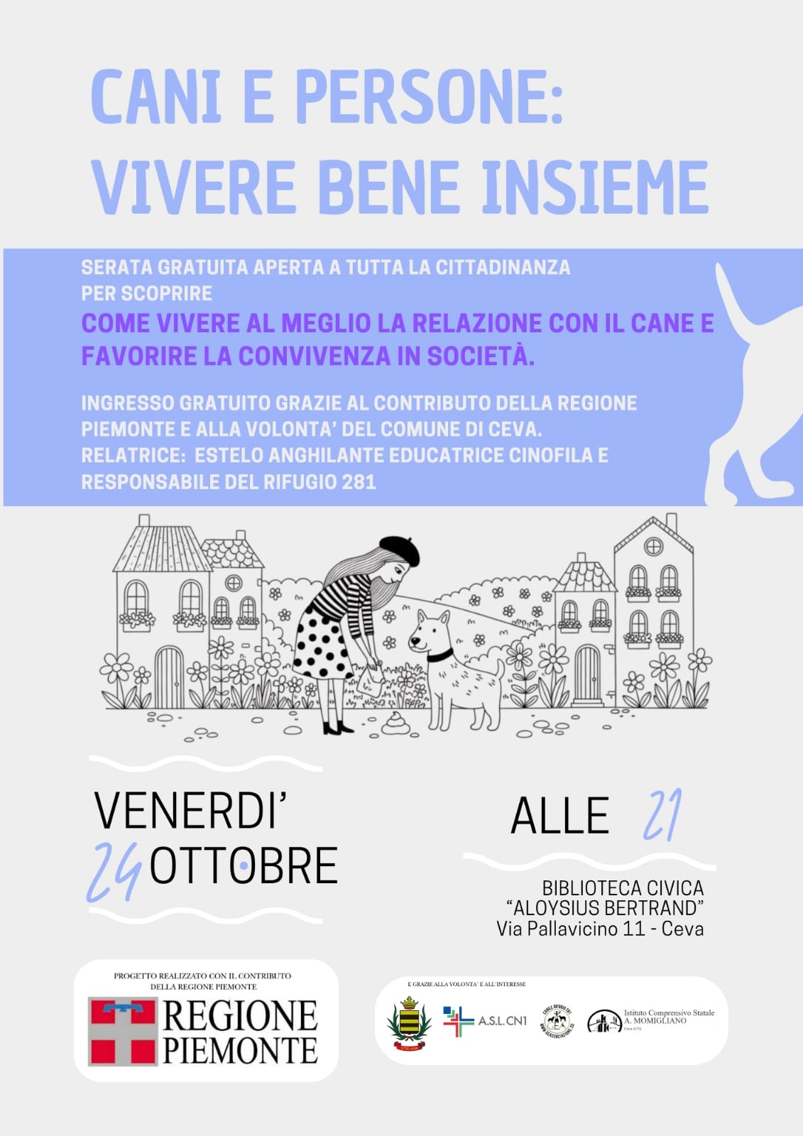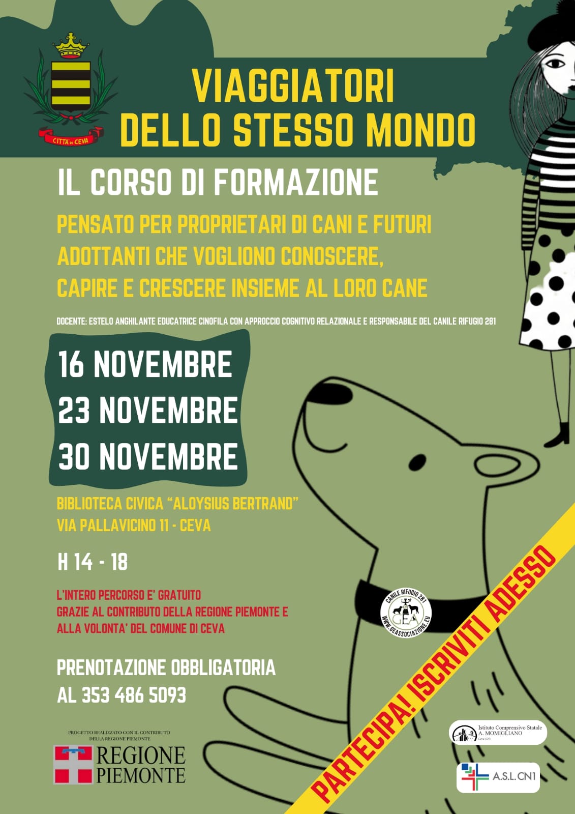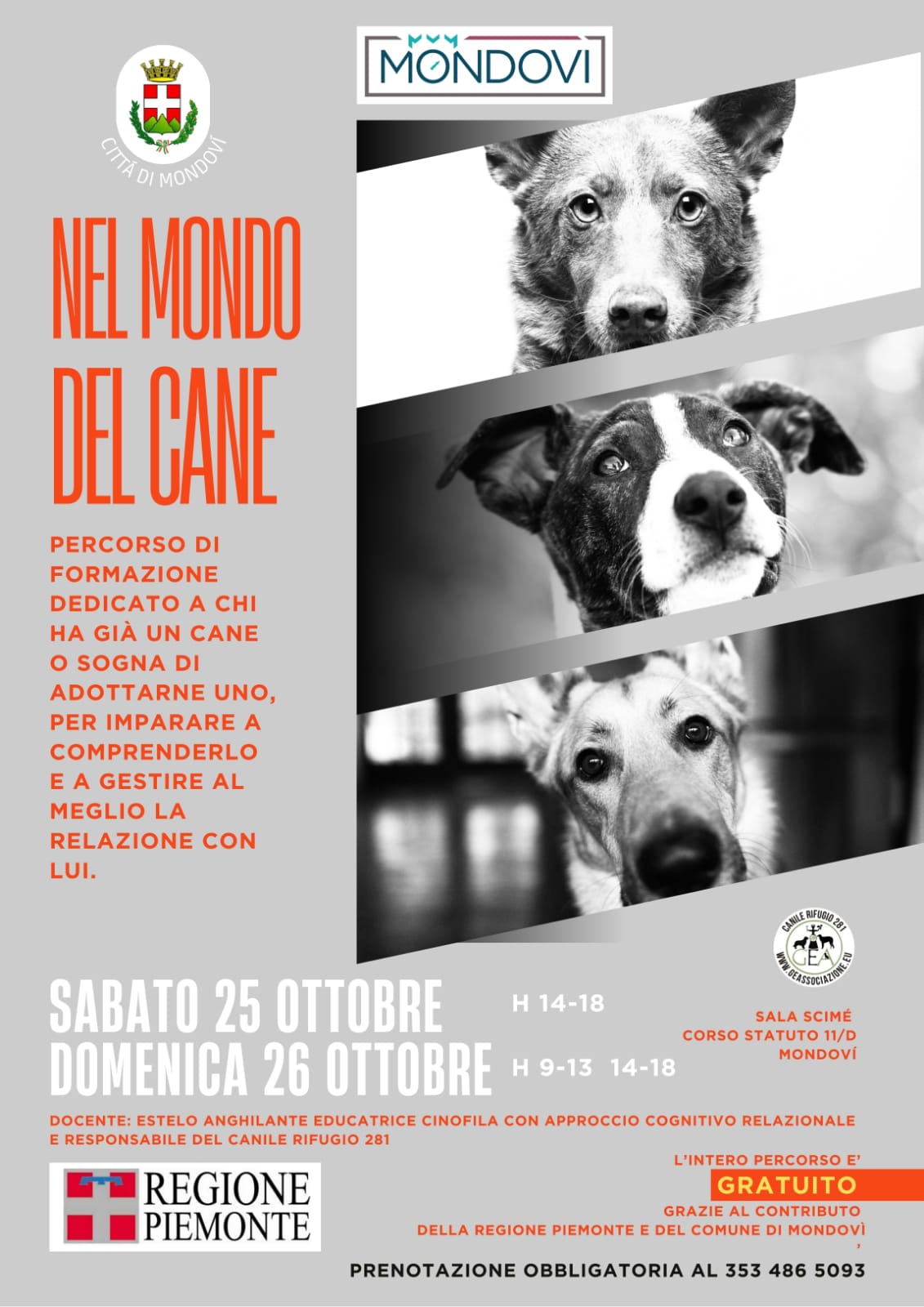 Dal 16 ottobre al 22 novembre arrivano a Mondovì e Ceva un ricco calendario di incontri, corsi e iniziative gratuite, rivolte a chi possiede un cane, a chi desidera adottarne uno, e a tutti coloro che vogliono conoscere meglio questi straordinari compagni di vita ma anche a chi volesse avvicinarsi al mondo del volontariato presso il Canile Rifugio 281. Gli appuntamenti saranno condotti da Estelo Anghilante, educatrice cinofila con approccio cognitivo, responsabile del Canile Rifugio 281 e autrice. Da anni Anghilante si impegna nella divulgazione e nella formazione per favorire una convivenza armoniosa tra persone e cani.
