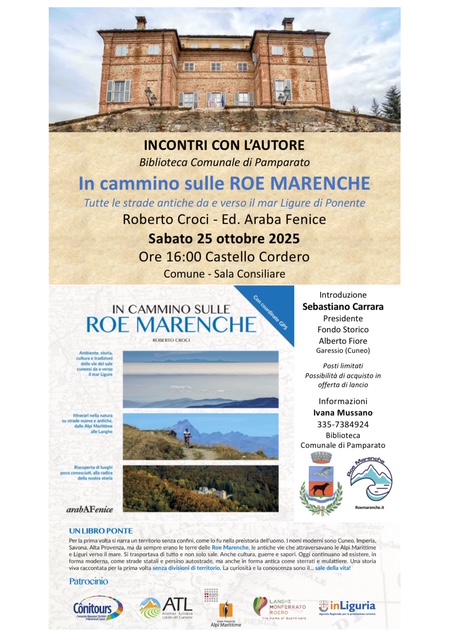 Sabato 25 ottobre alle ore 16:00, presso il Castello Cordero (Pamparato), avrà luogo la presentazione del nuovo libro di Roberto Croci "In cammino sulle ROE MARENCHE - Tutte le strade antiche da e verso il mar Ligure di Ponente". l'introduzione sarà a cura di Sebastiano Carrara, Presidente Fondo Storico Alberto Fiore. Ingresso libero.