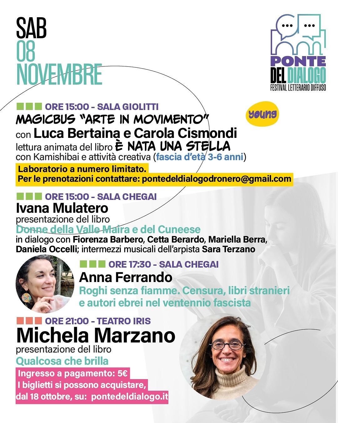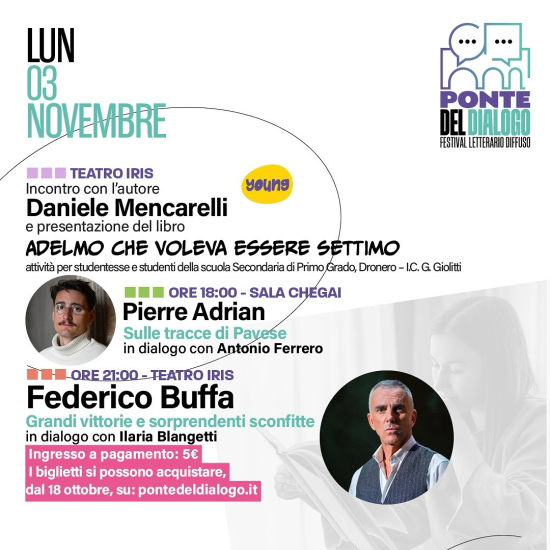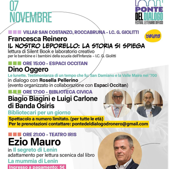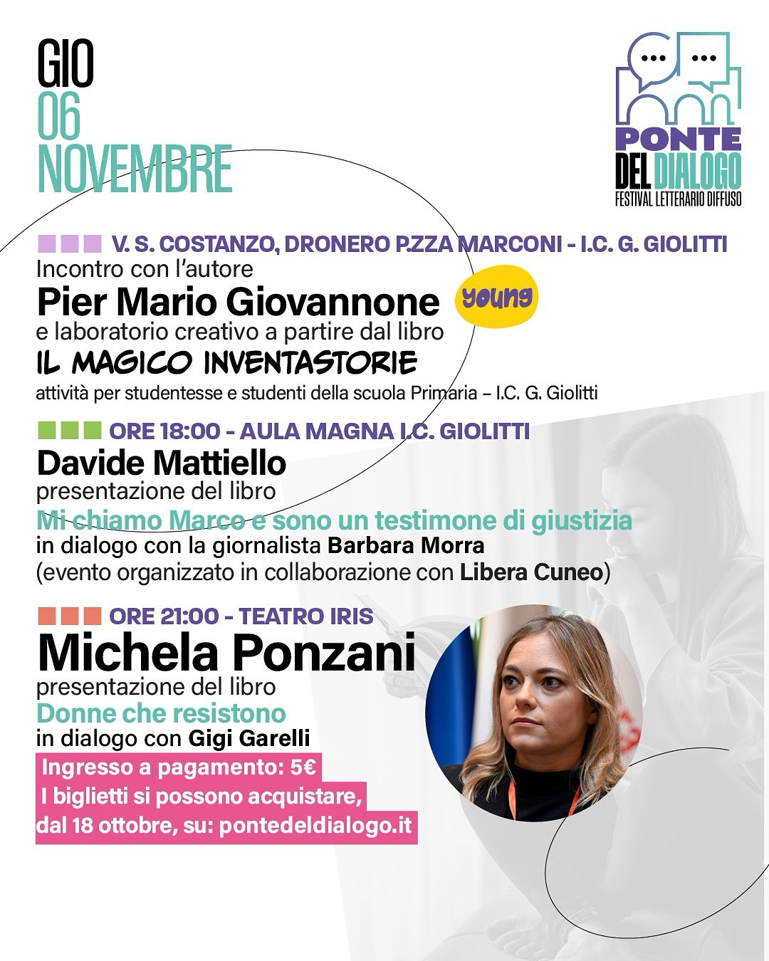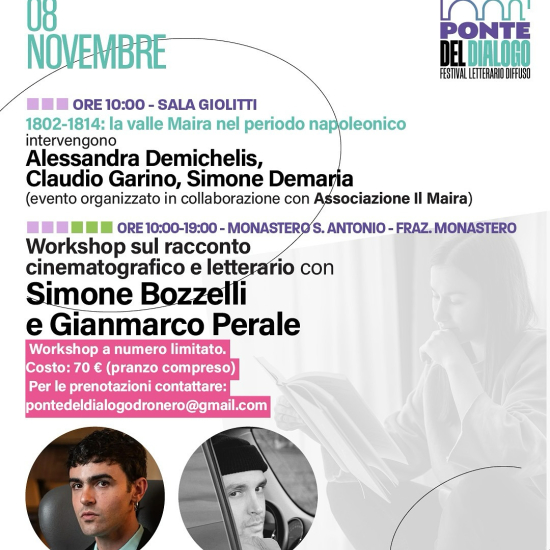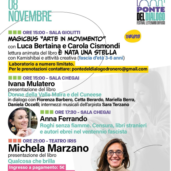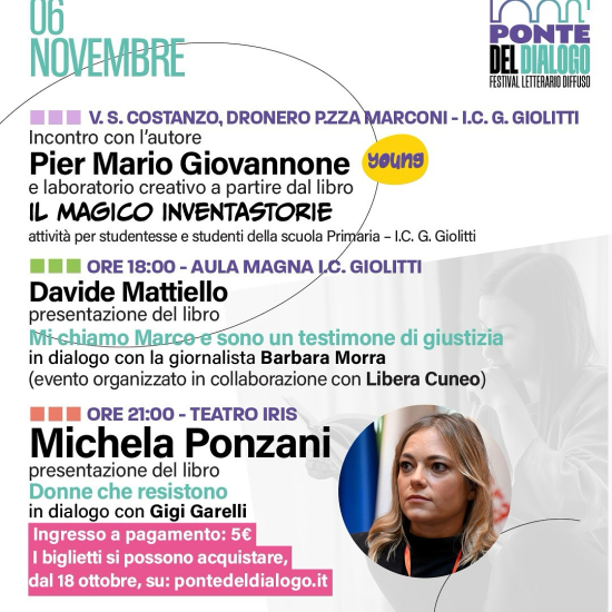 Dal 2 al 9 novembre 2025, Dronero si trasforma ancora una volta nel luogo dove le voci si incontrano e i pensieri si intrecciano con "Ponte del dialogo". Otto giorni per attraversare nuove storie, ascoltare voci sorprendenti e lasciarsi ispirare dal potere delle parole. Scopri il programma