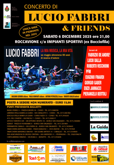 Sabato 6 dicembre alle ore 21,00 a Roccavione presso gli impianti sportivi (ex Bocciofila) si tiene il concerto (unica data in Piemonte 2025) di Lucio Fabbri & Friends, un viaggio attraverso 50 anni di musica d'autore.