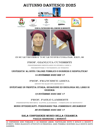 La Società Dante Alighieri - Comitato di Mondovì e il Museo della Ceramica di Mondovì presentano l'Autunno Dantesco 2025, una serie di incontri pubblici e a ingresso libero. L'invito è rivolto particolarmente a docenti e studenti; verrà rilasciato attestato di frequenza. Sarà inoltre possibile iscriversi alla Società Dante Alighieri.