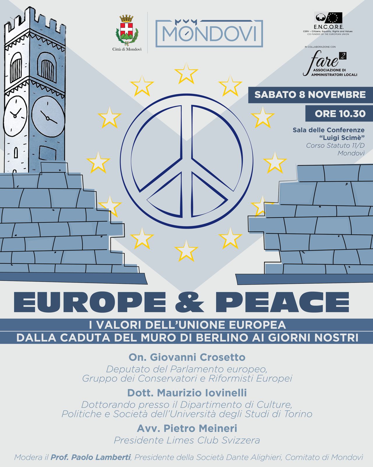 Sabato 8 novembre alle ore 10.30 la Sala delle Conferenze “Luigi Scimé” ospità il convegno “Europe & Peace. I valori dell’Unione Europea dalla caduta del Muro di Berlino ai giorni nostri” al quale prenderanno parte l’on. Giovanni Crosetto, il dott. Maurizio Iovinelli e l’avv. Pietro Meineri. Modera il prof. Paolo Lamberti. Domenica 9 novembre ore 9.30 in via dell’Arciprete, inaugurazione del “Murales della pace” realizzato dai ragazzi francesi, greci, italiani e sloveni; alle ore 11 nell'atrio dell’ex Tribunale cerimonia ufficiale di gemellaggio tra la Città di Mondovì e i Comuni di Brignoles (Francia), Renče - Vogrsko (Slovenia) e Sami (Grecia).