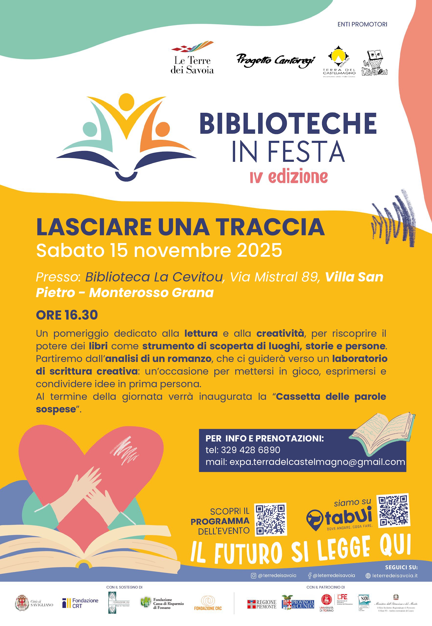 Sabato 15 novembre, alle ore 16.30, presso la Biblioteca “La Cevitou” (Via Mistral 89, Villa San Pietro – Monterosso Grana), si terrà un incontro dal titolo “Lasciare una traccia”, un momento di condivisione aperto a tutti.