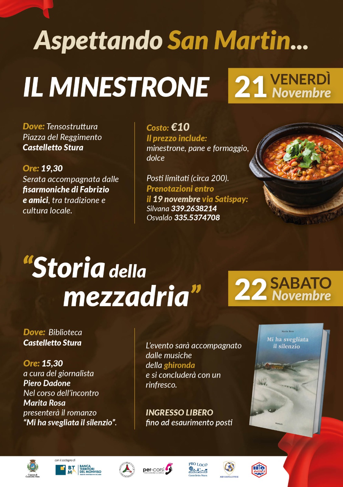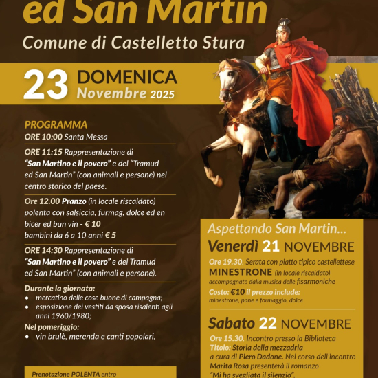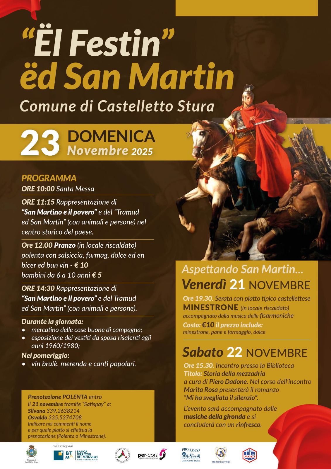 Domenica 23 novembre ritorna "El Festin ed San Martin": rievocazione storica con animali e figuranti che animerà le vie di Castelletto Stura con la rappresentazione di "San Martino e il povero" e del "Tramud ed San Martin". Durante la giornata mercatino agricolo ed esposizione di abiti da sposa vintage. La festa sarà anticipata venerdì 21 novembre dalla serata gastronomica dedicata al minestrone e sabato 22 novembre dall'incontro presso la biblioteca "Storia della Mezzadria" e presentazione del romanzo "Mi ha svegliato il silenzio".