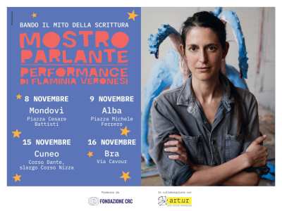 Mostro Parlante è una performance dell'artista Flaminia Veronesi che ha l’obiettivo di promuovere la riscoperta e l’utilizzo della scrittura come strumento di indagine di sé e di dialogo empatico. L’iniziativa nasce nell’ambito del Bando Il Mito della Scrittura della Fondazione CRC realizzata in collaborazione con l'associazione culturale Art.ur e si svolgerà il 9 novembre presso Piazza Cesare Battisti a Mondovi dalle 10 alle 13 e il 15 novembre in Corso Dante, slargo Corso Nizza, a Cuneo ore 15 - 18.