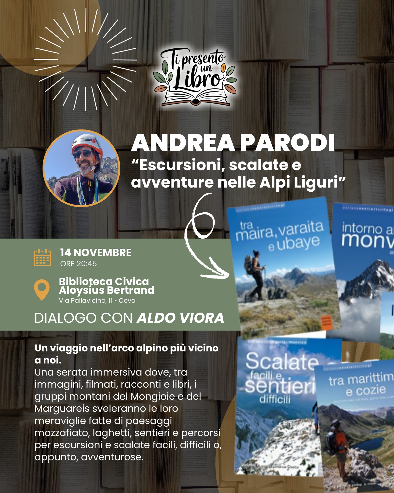 Venerdì 14 novembre, alle ore 20.45, la Biblioteca Civica Aloysius Bertrand di Ceva ospiterà l’autore e alpinista Andrea Parodi per una serata dal titolo “Escursioni, scalate e avventure nelle Alpi Liguri”, in dialogo con Aldo Viora.