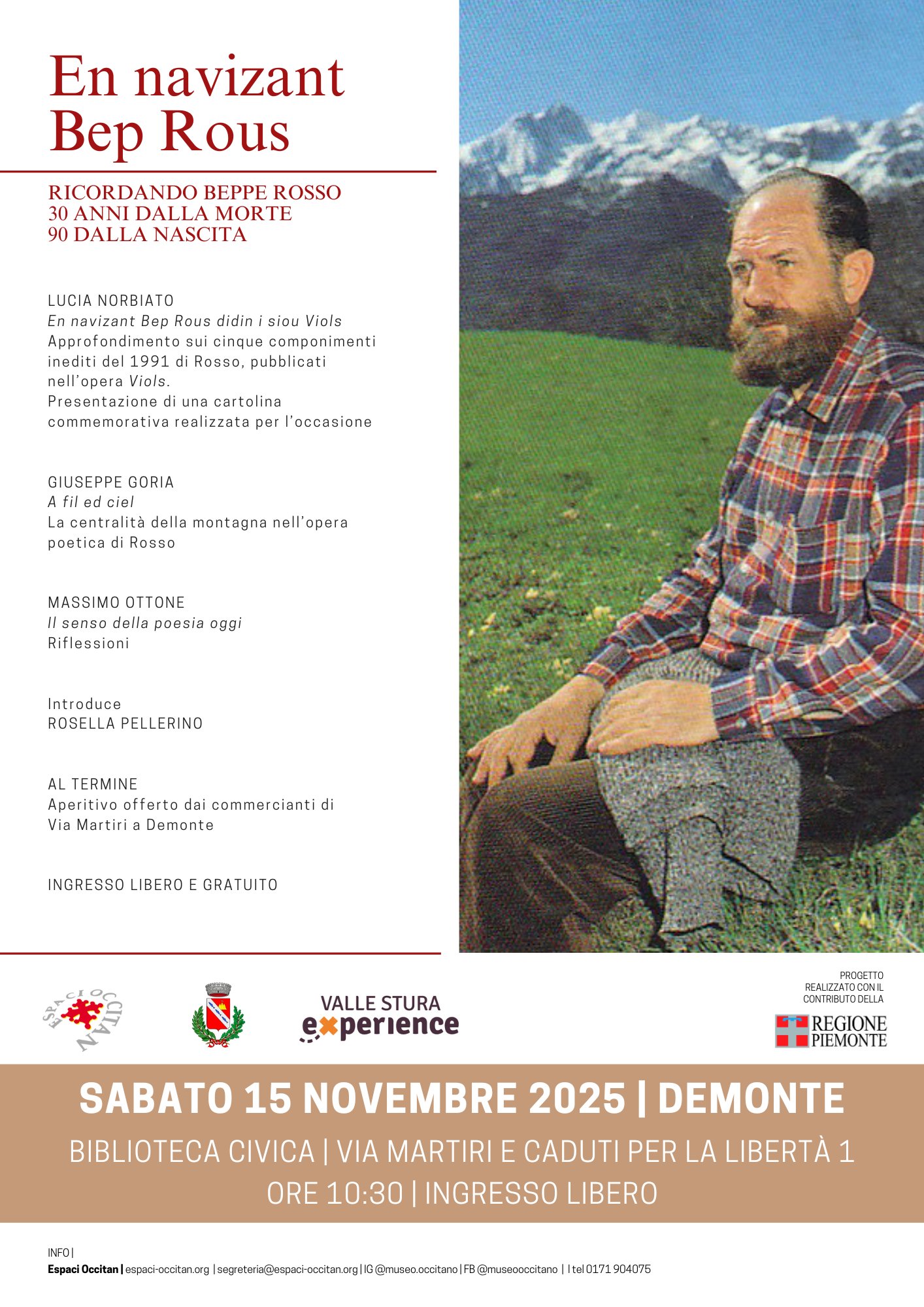 Sabato 15 novembre, a partire dalle ore 10,30 presso la Biblioteca Civica di Demonte, Rosella Pellerino ed i suoi ospiti vi attendono per un incontro letterario alla riscoperta della poesia dell'artista occitano Beppe Rosso. Ingresso libero e gratuito.