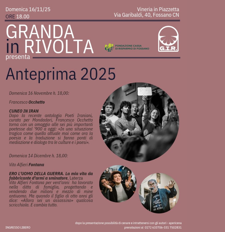 Per la rassegna “Granda in Rivolta”, appuntamenti letterari a Fossano presso La Vineria in Piazzetta, in Via Garibaldi 40, alle ore 18: domenica 16 novembre con Francesco Occhetto, autore di Cuneo e Iran, e domenica 14 dicembre con Vito Alfieri Fontana, autore di Ero l’uomo della guerra. La mia vita da fabbricante d’armi a sminatore. Ingresso libero.