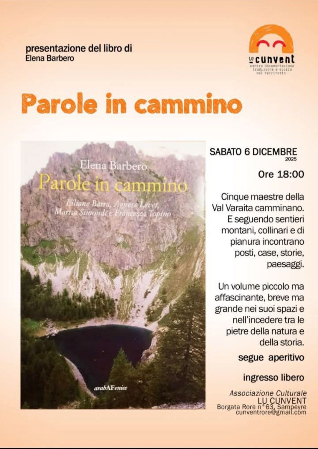 Sabato 6 dicembre alle ore 18.00, presso la sede dell'associazione culturale "Lu Cunvent" (Borgata Rore, 63, Sampeyre), si terrà la presentazione del libro "Parole in Cammino" a cura di Elena Barbero con Liliane Barca, Agnese Levet, Marisa Simondi e Francesca Topino. Ingresso libero, a seguire aperitivo.