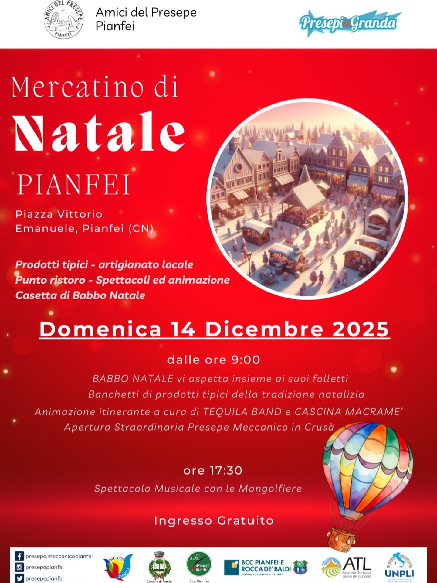 Pianfei si prepara ad accogliere la magia delle feste con il suo tradizionale mercatino di Natale, in programma per domenica 14 dicembre. L'evento, organizzato dagli Amici del Presepe di Pianfei e Presepi Granda, animerà Piazza Vittorio Emanuele a partire dalle ore 9:00, offrendo una giornata ricca di proposte e spettacoli per grandi e piccini. Ingresso libero.