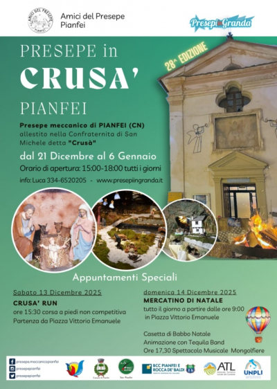 Da sabato 21 dicembre a martedì 6 gennaio, presso la confraternita di San Michele Arcangelo di Pianfei, detta Crusà, torna il tradizionale Presepe Meccanico organizzato dagli Amici del Presepe, allestito in circa 100 mq di superficie e con uno sviluppo in altezza di oltre 6 m. Aperto tutti i giorni dalle ore 15.00 alle ore 18.00, è un vero e proprio percorso attraverso grotte, paesaggi, montagne, cascate che portano alla grotta della natività, con la possibilità di camminare all'interno di un paesaggio magico.