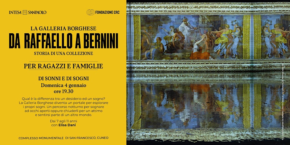 Domenica 4 gennaio, alle 19.30 a Cuneo presso il Complesso Monumentale di San Francesco, visita spettacolo notturna in mostra per bambini dai 7 agli 11 anni. Quale è la differenza tra un desiderio ed un sogno? La Galleria Borghese diventa un portale per esplorare i propri sogni. Attività organizzata all'interno della mostra "La Galleria Borghese. Da Raffaello a Bernini. Storia di una collezione". Evento gratuito con prenotazione obbligatoria.