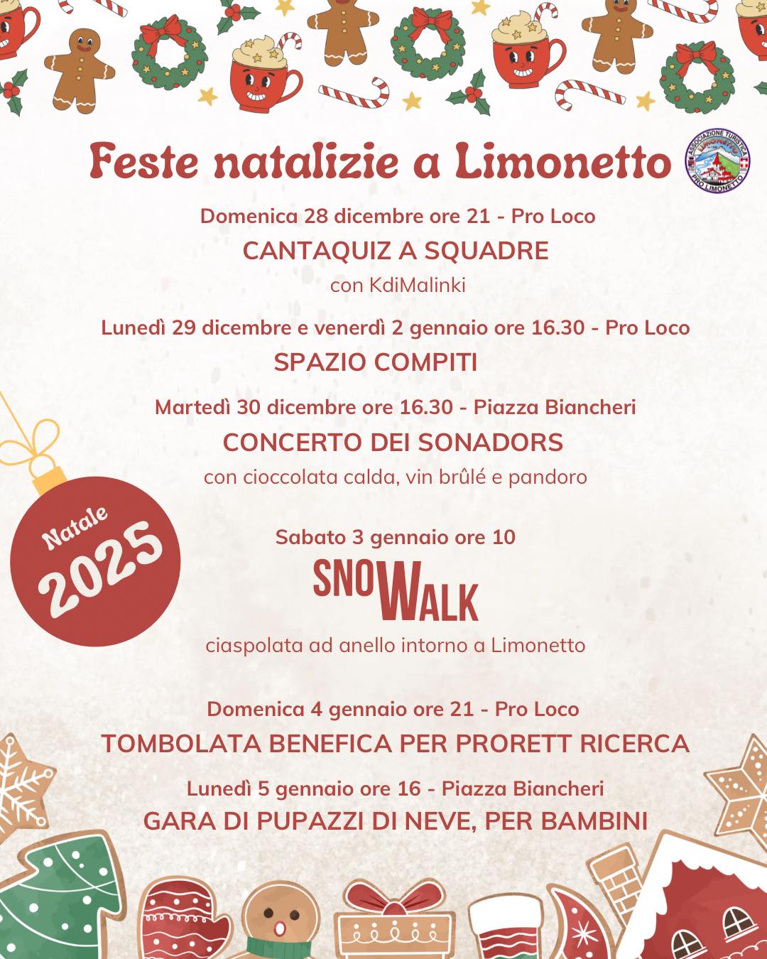 Limonetto (Limone Piemonte) si prepara a vivere un periodo festivo ricco di appuntamenti per tutte le età. Il programma offre un mix di musica, divertimento, sport e solidarietà. Le attività sono previste dal 28 dicembre al 5 gennaio 2026.