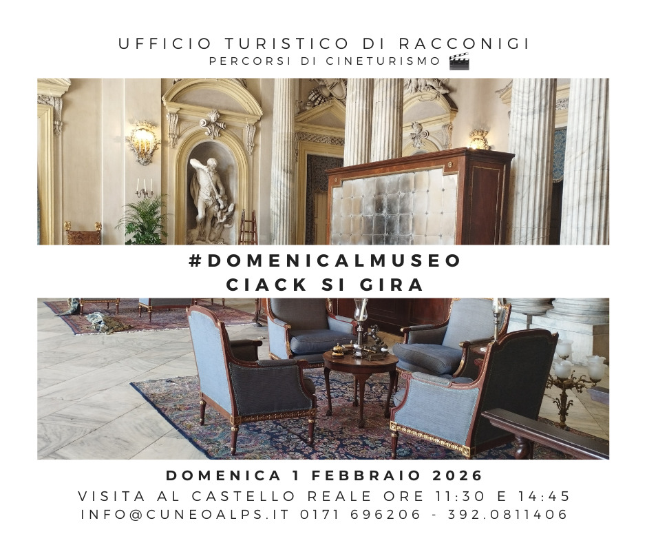Domenica 1 febbraio, alle ore 11.30 e 14.45, presso il Castello di Racconigi torna "Ciack si gira in Castello", la speciale visita guidata organizzata da CuneoAlps, arricchita di curiosità riguardanti le numerose occasioni in cui la residenza sabauda ha accolto produzioni di film e serie televisive. La prima domenica del mese l'ingresso è gratuito e la prenotazione è obbligatoria.