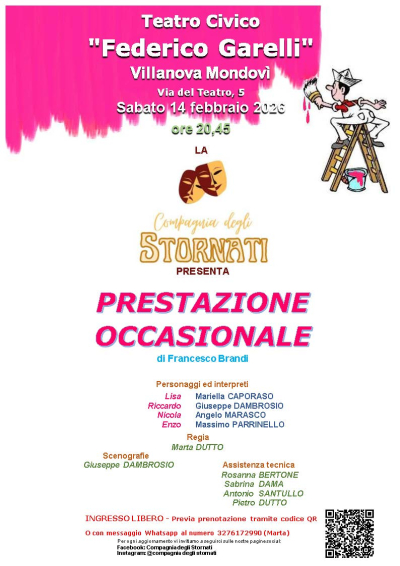 Sabato 14 febbraio 2026, alle ore 20,45, presso il Teatro Civico “FEDERICO GARELLI” di Villanova Mondovì, la “Compagnia degli Stornati” presenta la commedia brillante in due atti “Prestazione occasionale” di Francesco Brandi che ha vinto il premio “Achille Campanile 2017”. L’ingresso è libero e gratuito, previa prenotazione qui.
