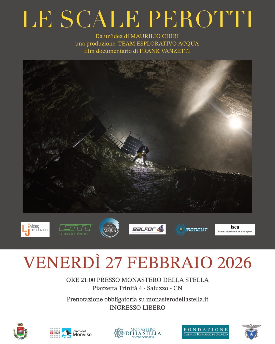 Venerdì 27 febbraio, alle ore 21.00, presso il salone del Monastero della Stella di Saluzzo si terrà la proiezione del documentario "Le scale Perotti", un film di Frank Vanzetti prodotto dal Team Esplorativo Acqua da un'idea dello speleologo saluzzese Maurilio Chiri. Ingresso libero, con prenotazione obbligatoria.