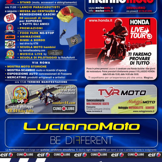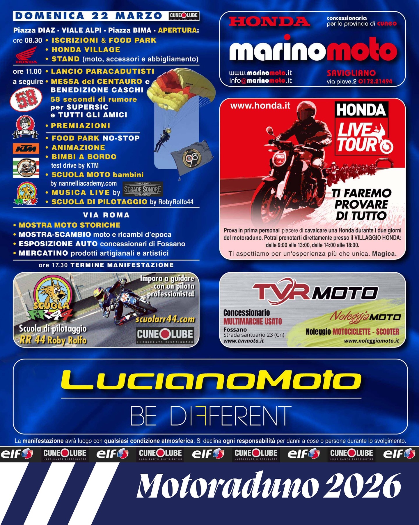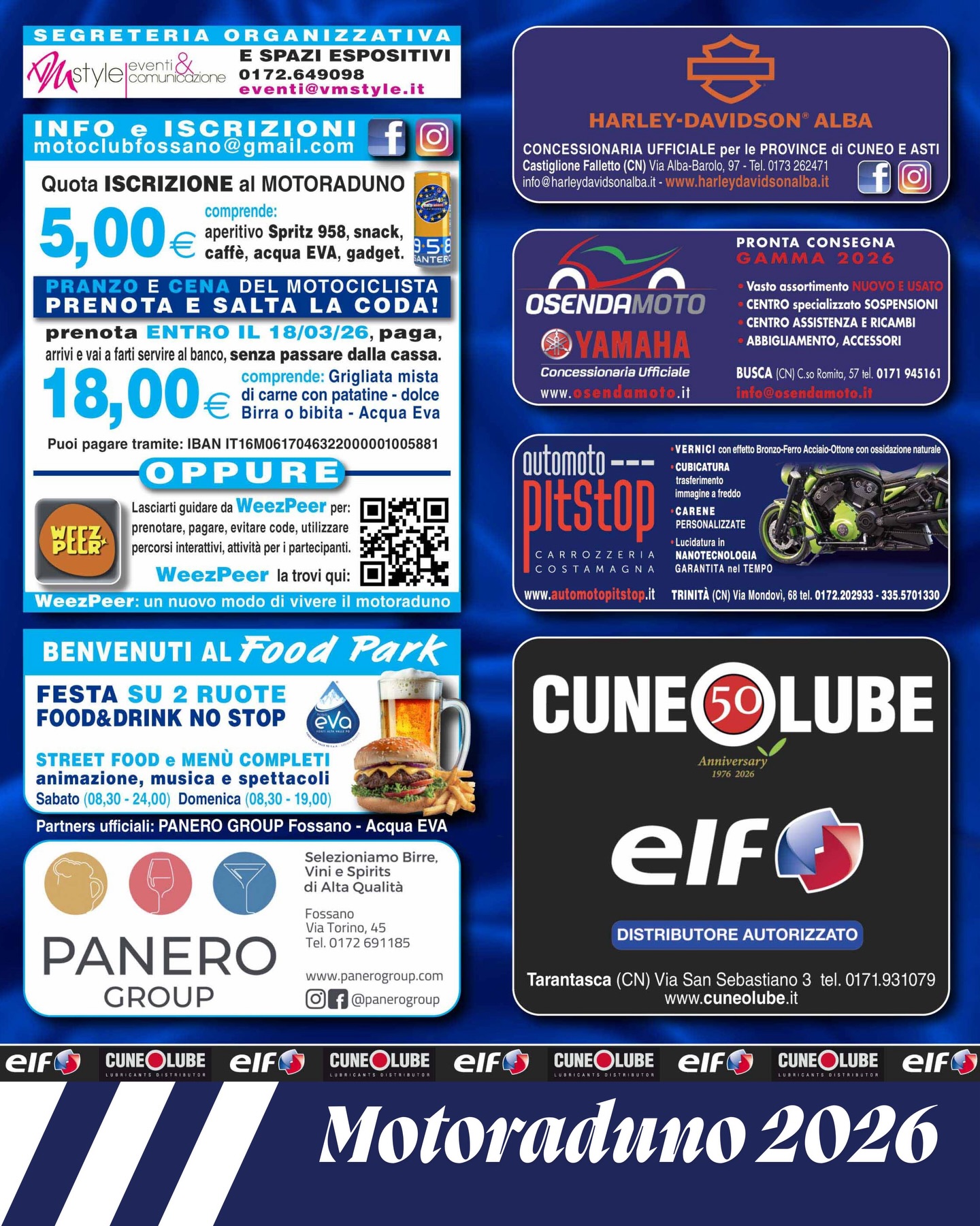 Da venerdì 20 marzo a domenica 22 marzo torna a Fossano il tradizionale Motoraduno di Primavera, che quest'anno assume una dimensione internazionale grazie a un prestigioso riconoscimento della Federazione Internazionale di Motociclismo. Un intero weekend dedicato alla passione per le due ruote, con stand espositivi, mercatino, moto storiche, test drive e mototour. Ad animare l'evento non mancheranno musica live e intrattenimento per tutta la durata della manifestazione.