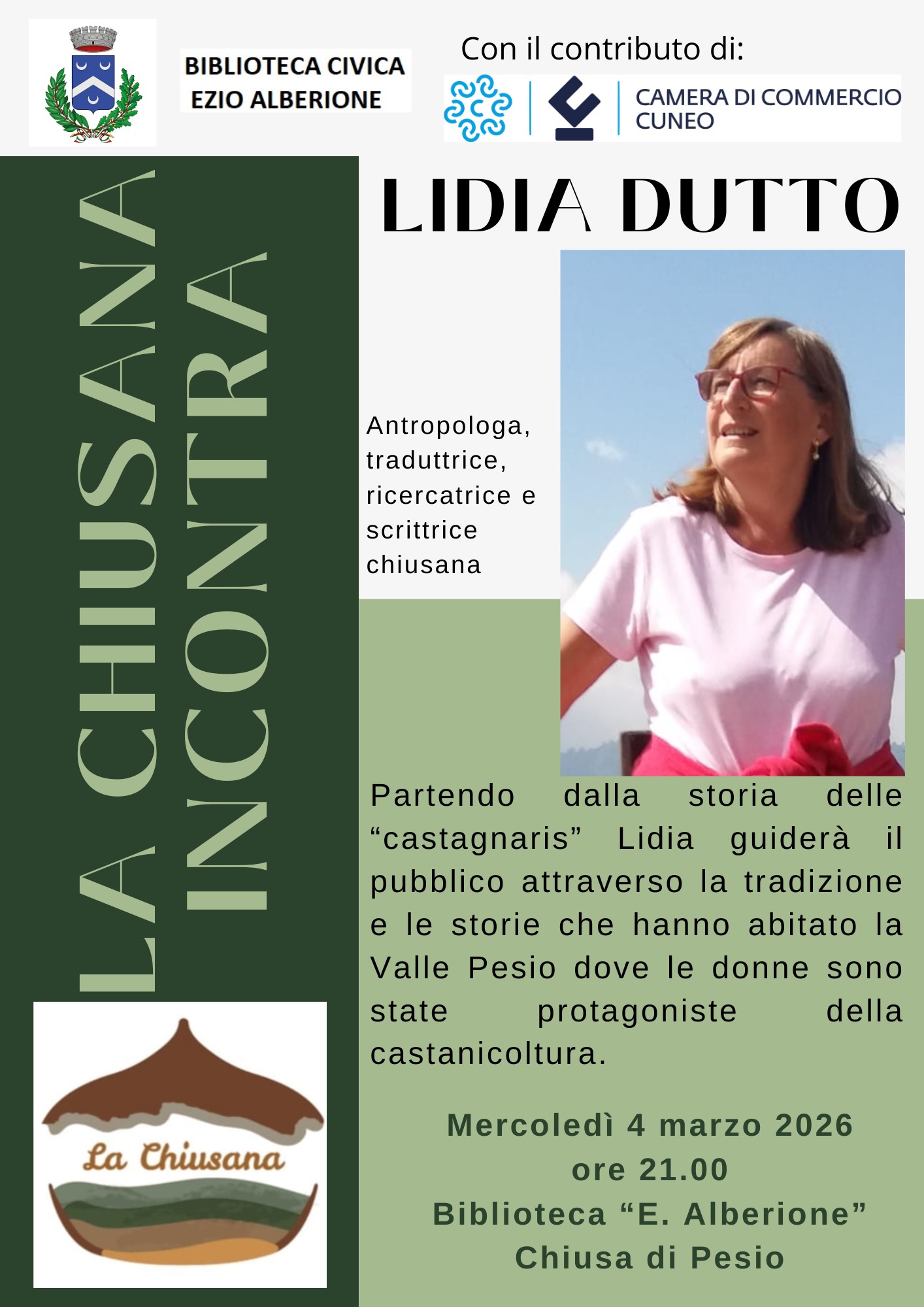 Mercoledì 4 marzo alle ore 21.00 presso la Biblioteca civica "E. Alberione" di Chiusa di Pesio l'Associazione "La Chiusana" incontra l'antropologa, traduttrice, ricercatrice e scrittrice chiusana Lidia Dutto.
