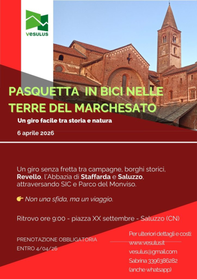 Il 6 aprile le guide Vesulus propongono un itinerario ciclistico facile, lungo circa 40 km con 350 metri di dislivello, pensato per scoprire con calma e curiosità le Terre del Marchesato. Un percorso accessibile a tutti, ideale per Pasquetta. Ritrovo a Crissolo, prenotazione obbligatoria.