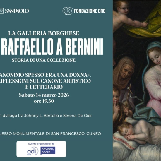 Anonimo spesso era una donna. Sabato 14 marzo, alle ore 19.30, al Complesso Monumentale di San Francesco a Cuneo viene proposta una riflessione sul canone artistico e letterario, con un dialogo tra Johnny L. Bertolio e Serena De Gier. L’evento si inserisce nel programma dell’edizione 2026 della rassegna “8 marzo è tutto l’anno” nell'ambito della mostra "La Galleria Borghese. Da Raffaello a Bernini. Storia di una collezione". Evento gratuito a prenotazione obbligatoria.