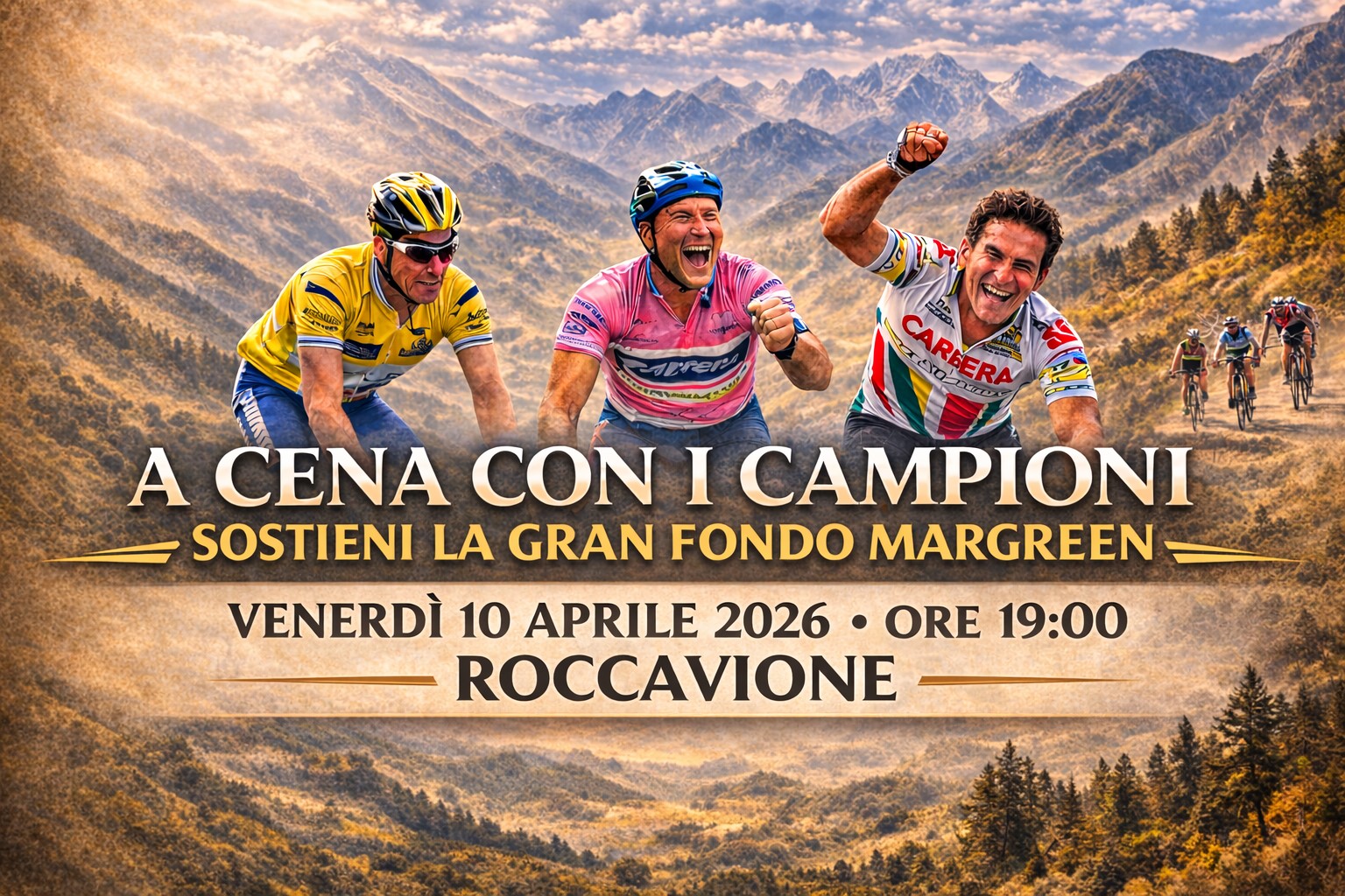A Cena con i Campioni a Roccavione venerdì 10 aprile 2026 alle ore 19:00 al Centro Polifunzionale in Via Provinciale Roaschia, 1 . Cena di Gala per sostenere la Gran Fondo MarGreen di Entracque, inserita nel prestigioso circuito L’Étape Italy by Tour de France.
