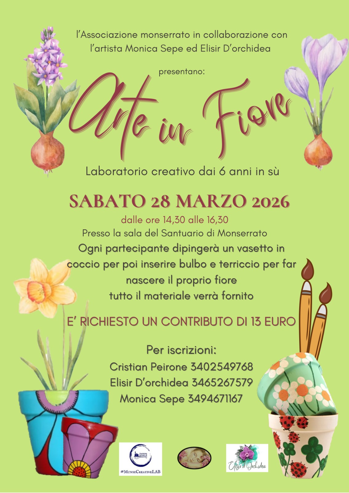 Sabato 28 marzo, dalle ore 14,30 alle ore 16,30 presso il Santuario di Monserrato di Borgo San Dalmazzo, l'Associazione Santuario Monserrato in collaborazione con l’artista Monica Sepe ed "Elisir d’Orchidea", presenta “Arte in fiore”, un laboratorio creativo che unisce pittura e giardinaggio. Ogni partecipante avrà l’opportunità di decorare un vasetto in coccio e piantare al suo interno un bulbo, da cui vedrà nascere il proprio fiore. Evento a pagamento, prenotazione necessaria.