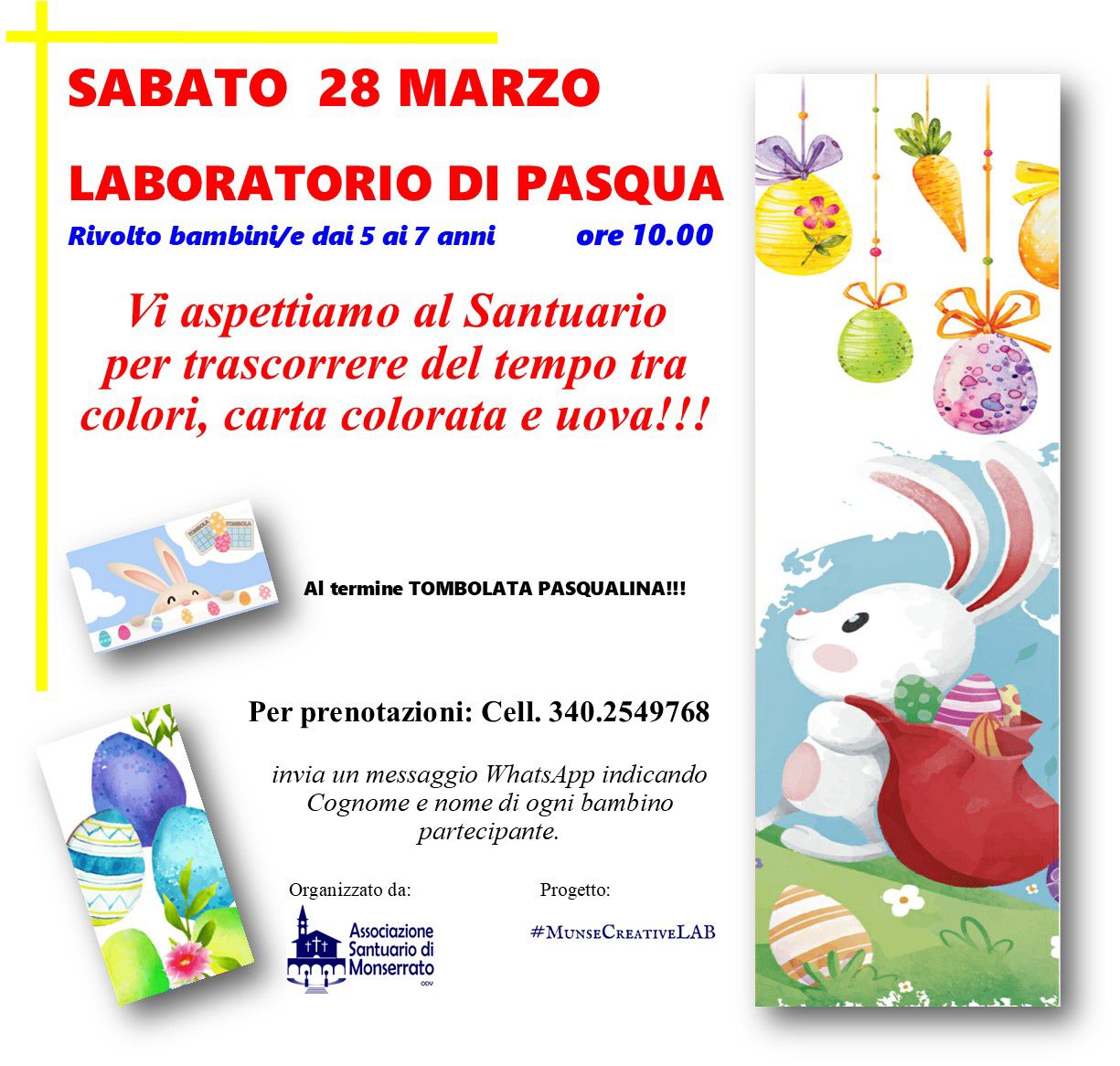 Sabato 28 marzo, alle ore 10,00 presso il Santuario di Monserrato di Borgo San Dalmazzo, appuntamento con il "Laboratorio di Pasqua" rivolto a bambini e bambine dai 5 ai 7 anni. A seguire tombolata pasqualina! Prenotazione necessaria.