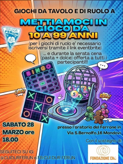 Un nuovo appuntamento di “Mettiamoci in gioco” è in arrivo sabato 28 marzo 2026 a partire dalle ore 18 presso i locali dell’oratorio della Parrocchia di Santa Maria Maggiore a Mondovì. Sarà possibile prendere parte ai tavoli dei giochi di ruolo (iscrizione obbligatoria qui) e/o cimentarsi in giochi da tavolo (per i quali non è necessaria la prenotazione).