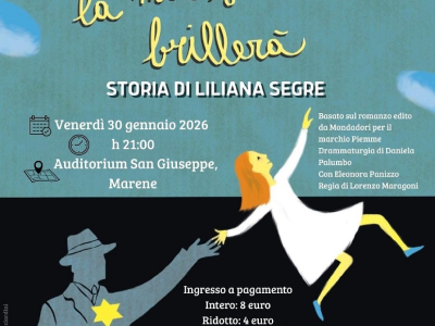 In occasione della Giornata della Memoria, venerdì 30 gennaio alle ore 21 presso l'Auditorium San Giuseppe di Marene, spettacolo teatrale FINO A QUANDO LA MIA STELLA BRILLERA' - Storia di Liliana Segre.