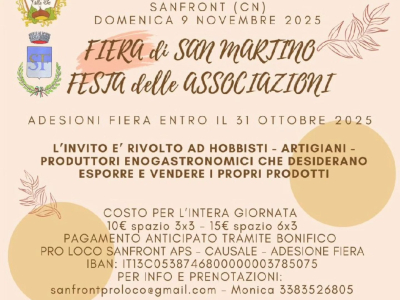 La Fiera di San Martino e Festa delle Associazioni a Sanfront domenica 9 novembre 2025. Esposizione e vendita di prodotti in una giornata di festa che richiama ogni anno molti visitatori.