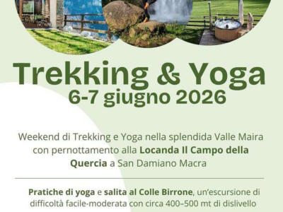 Sabato 6 e domenica 7 giugno, presso la locanda "Il campo della quercia" a San Damiano Macra, vi attendono due giornate di pratiche yoga e un'escursione al Colle Birrone di difficoltà moderata.