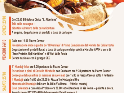 Da giovedì 22 a domenica 25 ottobre la 28ª edizione della “Festa del Re Marrone”, l’imperdibile appuntamento che celebra il Marrone di Chiusa di Pesio, pregiato frutto tipico della zona agricola delle “Vigne”.