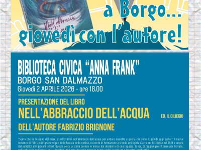 Giovedì 2 aprile, ore 18, nell'ambito della rassegna "A Borgo… giovedì con l'autore!", la Biblioteca civica “Anna Frank” di Borgo San Dalmazzo ospita la presentazione del romanzo "Nell’abbraccio dell’acqua" di Fabrizio Brignone. Ingresso libero.