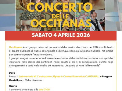 Sabato 4 aprile, alle ore 17,00 presso Borgata Castellaro (Comune di Celle Macra), si esibiranno in concerto le "Occitanas". Evento gratuito, prenotazione necessaria.