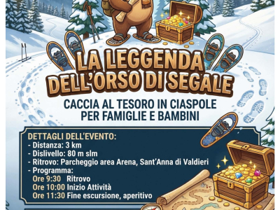 Sabato 21 febbraio, a partire dalle ore 9,30 presso Sant'Anna di Valdieri, vi aspetta una straordinaria caccia al tesoro in ciaspole per famiglie e bambini. Evento a pagamento, prenotazione necessaria.