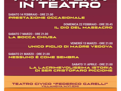 Venerdì 13 marzo alle ore 21.00, presso il teatro civico "Federico Garelli" di Villanova Mondovì, andrà in scena lo spettacolo teatrale "Unico figlio di madre vedova".