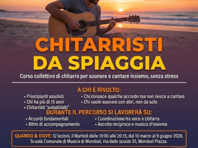 La Scuola Comunale di Musica di Mondovì propone il corso Chitarristi da Spiaggia, per chi desidera imparare ad accompagnarsi cantando in modo semplice, spontaneo e conviviale.