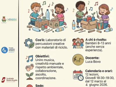 Alla Scuola Comunale di Musica di Mondovì prende vita Dal riciclo nasce il ritmo!, un laboratorio di percussioni creative dedicato ai bambini dagli 8 ai 13 anni.