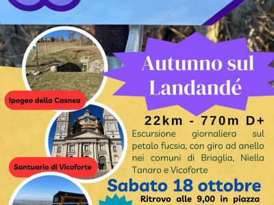 Sabato 18 ottobre, giornata interamente dedicata al trekking lungo il Landandé, nel cuore delle Langhe monregalesi. L'iniziativa propone un percorso ad anello tra i comuni di Briaglia, Niella Tanaro e Vicoforte.