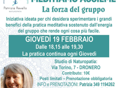 Giovedì 19 febbraio, dalle ore 18,15 alle ore 19,30 a Dronero (Via Torino 7), vi attende un incontro meditativo di gruppo in compagnia dell'insegnante di meditazione Patrizia Revello. Evento a pagamento, prenotazione necessaria.