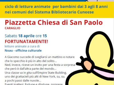 Sabato 18 aprile, alle ore 15,00 presso la Piazzetta di Chiesa di San Paolo a Caraglio si terrà un ciclo di letture animate per bambini dai 6 agli 8 anni a cura di "Noau - Officina Culturale". Ingresso libero e gratuito.