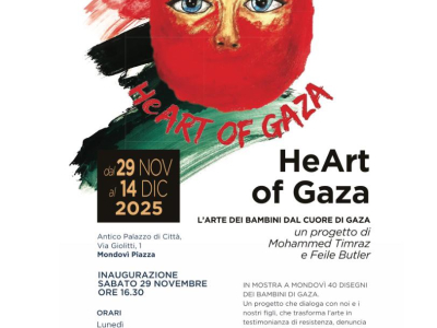 HeART of Gaza è una mostra itinerante di opere d’arte create da bambini dai 3 ai 17 anni che vivono o vivevano a Gaza. È organizzata a Mondovì dalle Donne in cammino per la pace Mondovì e dal Tavolo di coordinamento comunale per la pace e l’educazione ad una cittadinanza attiva,