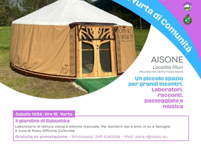 Sabato 11 aprile, alle ore 15,00 in località "Pilun" ad Aisone, in occasione della rassegna culturale "Una yurta di comunità" vi attende il laboratorio di lettura visiva e attività manuale "Il giardino di Babushka".