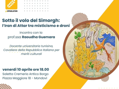 "Sotto il volo del Simorgh: l'Iran di Attar tra misticismo e droni" è il titolo dell'incontro previsto per venerdì 10 aprile alle ore 18 presso la Saletta della Cremeria Antico Borgo (piazza Maggiore 18).
