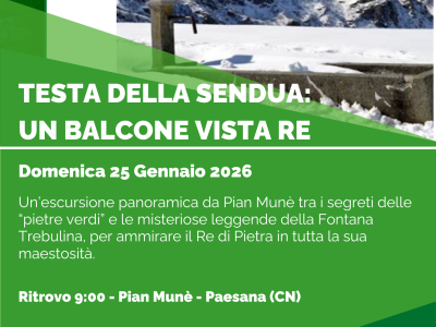 Il 25 gennaio le guide escursionistiche di Vesulus organizzano un'escursione guidata, con partenza da Pian Muné (Paesana) alle 9 verso la Testa della Sendua in un itinerario ad anello che porta al cospetto del Re di Pietra, il Monviso. Lungo il percorso si attra